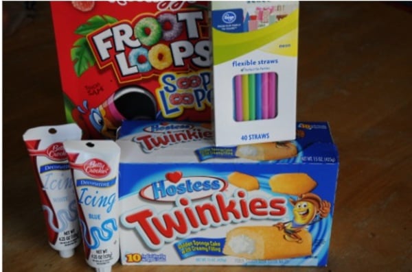 All you need is a box of Twinkies, Fruit Loops or other cereal with circles, a flexible drinking straw, and some icing.