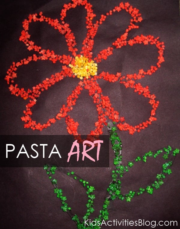 playing with our pasta before. Macaroni art is not a new concept, but something that is easy and fun to do. So, I went ahead and pulled out a few boxes of different shaped pastas from the pantry. My son glued some plain pasta onto the sheets of construction paper and was delighted with his artwork.