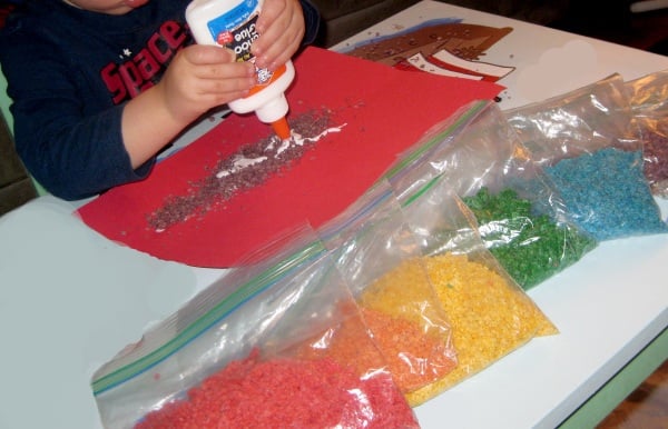 Take a handful of macaroni glitter and sprinkle it on the glue. When all of the glue is covered up (no white peeking through), gently pick up the piece of paper and the excess glitter will slide off. Fill in any missed spots, scoop the rest of the glitter up, and put it back in the bag. Repeat until your design is finished!