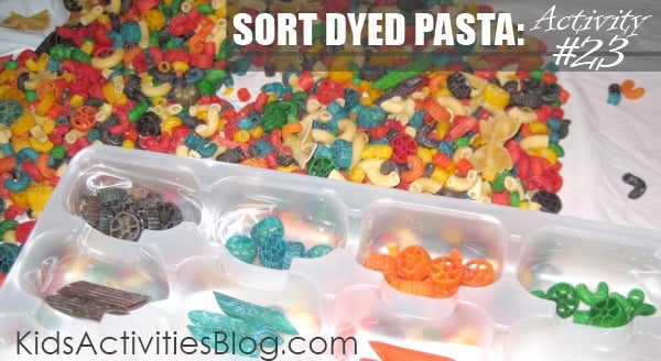 Some of the best toys are the free ones. Pasta became one of those unexpected “play supplies” in our house. Please tell me I am not the only parent who discovered a box of pasta – far past it’s expiration date – in the back of my pantry! Time to put that pasta to use! Here are some ideas of ways that you can play with your old pasta. For starters though, you’ll want to check out our first post, Macaroni Art. We explain how to dye your noodles – colored pasta is more fun!