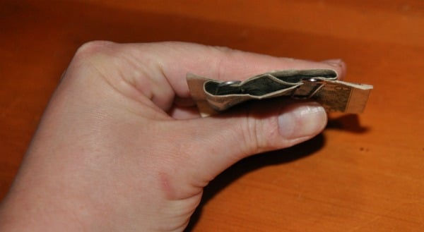 Step 4: Each paper clip should only clip over two pieces of the dollar bill. Here’s a view from the top.