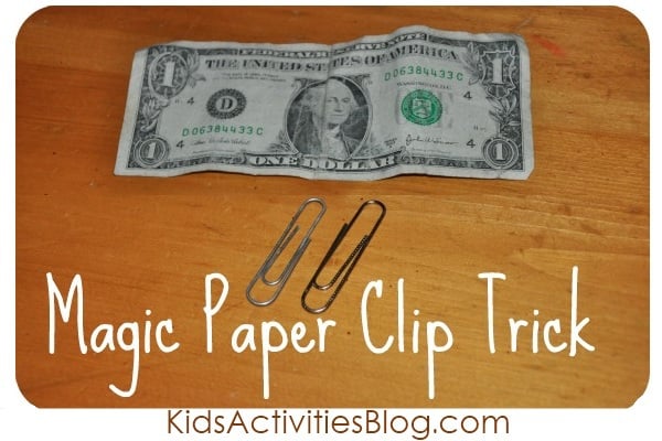 We love simple magic tricks – the kids love discovering the “secrets” or the science behind the experiments.   This magic trick uses a dollar bill and paper clips.   It can’t be any easier than that!
