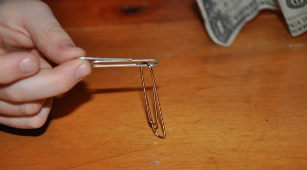 Step 6:   The paper clips will magically attach to each other and jump off the bill.