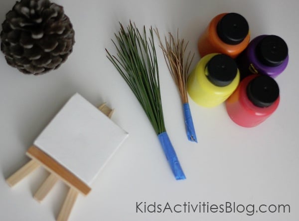 We have some huge pine trees in our backyard that are always dropping tons and tons of pine needles. This week we decided to collect a bunch of them (plus a few pine cones) and make some pine needle paintbrushes. We used the pine needle paintbrushes to create some mini masterpieces on these itty bitty canvases that I bought.