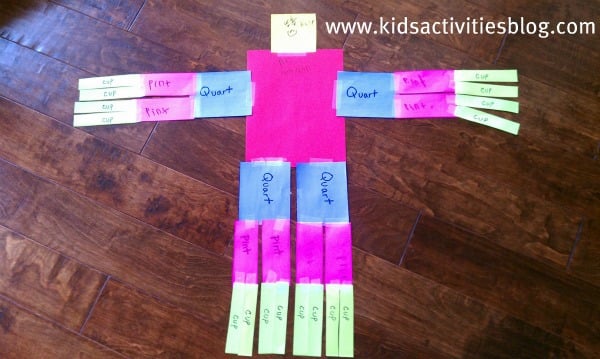 You need 5 different colors of paper of the same size. Start with one color for his body & label his chest with Gallon Guy. For his arms/legs, take the next sheet and cut it into 4 equal parts. Label these Quart and attach them to Gallon Guy. Take another sheet of paper, and cut it into 8 pieces. Label each one Pint and attach these to the arms/legs. Be sure to leave a little space between the pieces so your child can see the different parts. Now, take another color paper and cut it into 16 pieces, all equal in size. These will be labeled Cup and added as Gallon Guy’s fingers & toes. Last, cut a square out of your last color to give Gallon Guy a head!