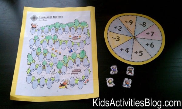 The object of the game is to get your raccoon from start to finish first. ย How do you do that? ย Look at the number your Raccoon is standing on. ย Spin the spinner, and divide the number you’re standing on by the number on the spinner. ย Whatever the remainder is indicates how many spaces your Raccoon gets to move.