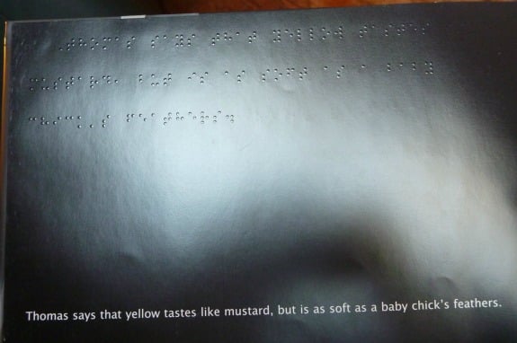 This page reads, “Thomas says yellow tastes like mustard, but is as soft as a baby chick’s feathers.”