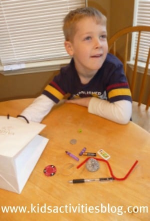 blind or vision-impaired and couldn’t see the things around them. I filled a bag with little items from around the house and without looking he had to feel around in the bag and guess what the objects were. ย He absolutely loved this activity but it was certainly challenging for him at times.