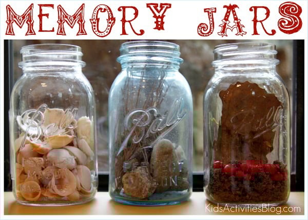 We use the jars to remember vacations. ย The contents are precious to us, but usually consist of rocks, sticks, berries, shells, small items found along a trail or at a park.