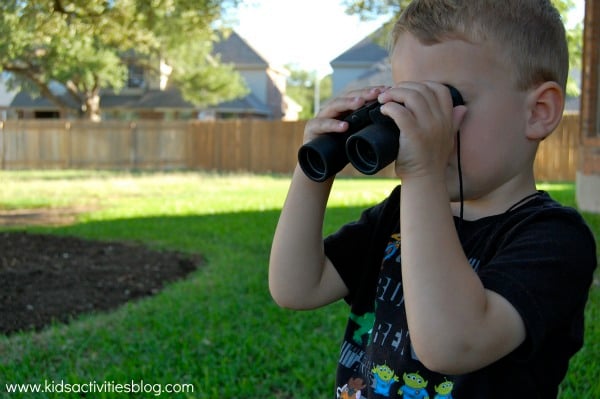 Magnifying Glass/Binoculars: (affiliate links) I am encouraging him to take a closer look at things and discover treasures hidden in plain view. Last week we saw tiny bugs crawling all over a rock. We grab the binoculars when we see a bird in the sky that we want to take a closer look at.