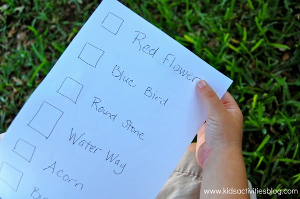 Nature Hike Checklist: I created a checklist to encourage my son to look for things. We make it into a game to see who can spot an item from the list first. Ours is pretty basic – a red bird, a yellow flower, a round rock, etc. “ but can be adapted to fit any learning level.