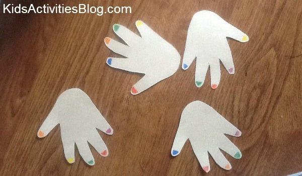 Next, on a new piece of paper, we traced over Rory’s hands and cut them out. We then colored Rory’s fingernails, discussing colors (currently Rory just likes red and blue, but with continued positive reinforcement, I know she will get it!). I had to cut out extra hands because Rory liked to give them high-fives.
