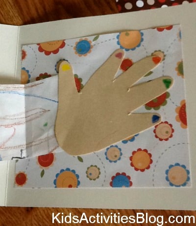 We then glued the right end of the arm length paper to her cut out right hand. Then we glued the hand to the middle of right side of the card.