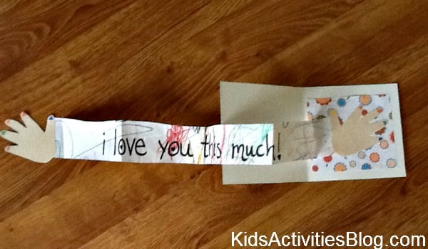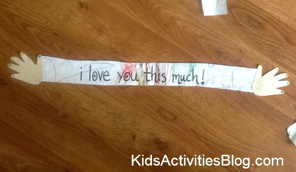 I folded the arm length paper accordion style and glued the left hand to the left side of the i love you this much paper.