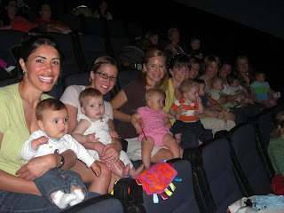 A CryBaby matinee is a daytime showing of a film where it is OK for moms to bring their babies and let them talk, play, and even cry during the film. I think there must have been 50 or more moms there including our group, with babies of various ages – from a few days or weeks old, up to small toddlers. The area in front of the seats was full of empty strollers. The theater even put a changing table up in the middle front area so you could change your baby without missing any of the film!