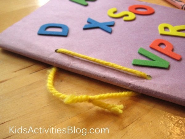 We used cardstock to make the pages, in lots of cheerful colors. We didn’t work in alphabetical order but instead I asked my daughter to choose which letters she wanted to make a page for first. Of course she wanted to start with her own initial and it was interesting to see which order she went in next – picking words that were special to her and which she was familiar with. We made each letter on a separate piece of cardstock so that we could talk about alphabetical order at the end and re-organize the letters to go in the finished book.