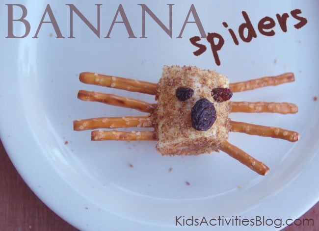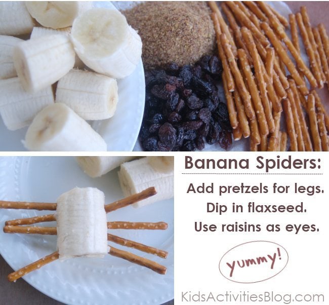 I’ve seen spiders made with marshmallows and pretzels, but I wanted a healthier option to make with my kids. We substituted bananas for the marshmallows for our food art.