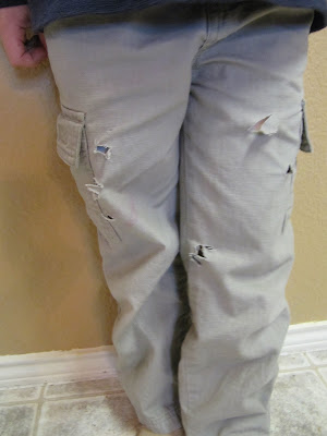 Mind you, these pants were ON the boy at the time said incident occurred. He went to school with intact pants and when I picked him up he looked like he had had an encounter with Edward Scissorhands! When I asked him what happened all I got for a response was, “I don’t know”. But after a little more coaxing I learned that he was supposed to be doing work at his desk but he was bored so he got out his scissors and cut his pants. Hmmm, not what I would have thought to do if I were bored but hey who am I to question that line of reasoning from a 5 year old. He did get a brief reminder about taking care of our things and how money doesn’t grow on trees.