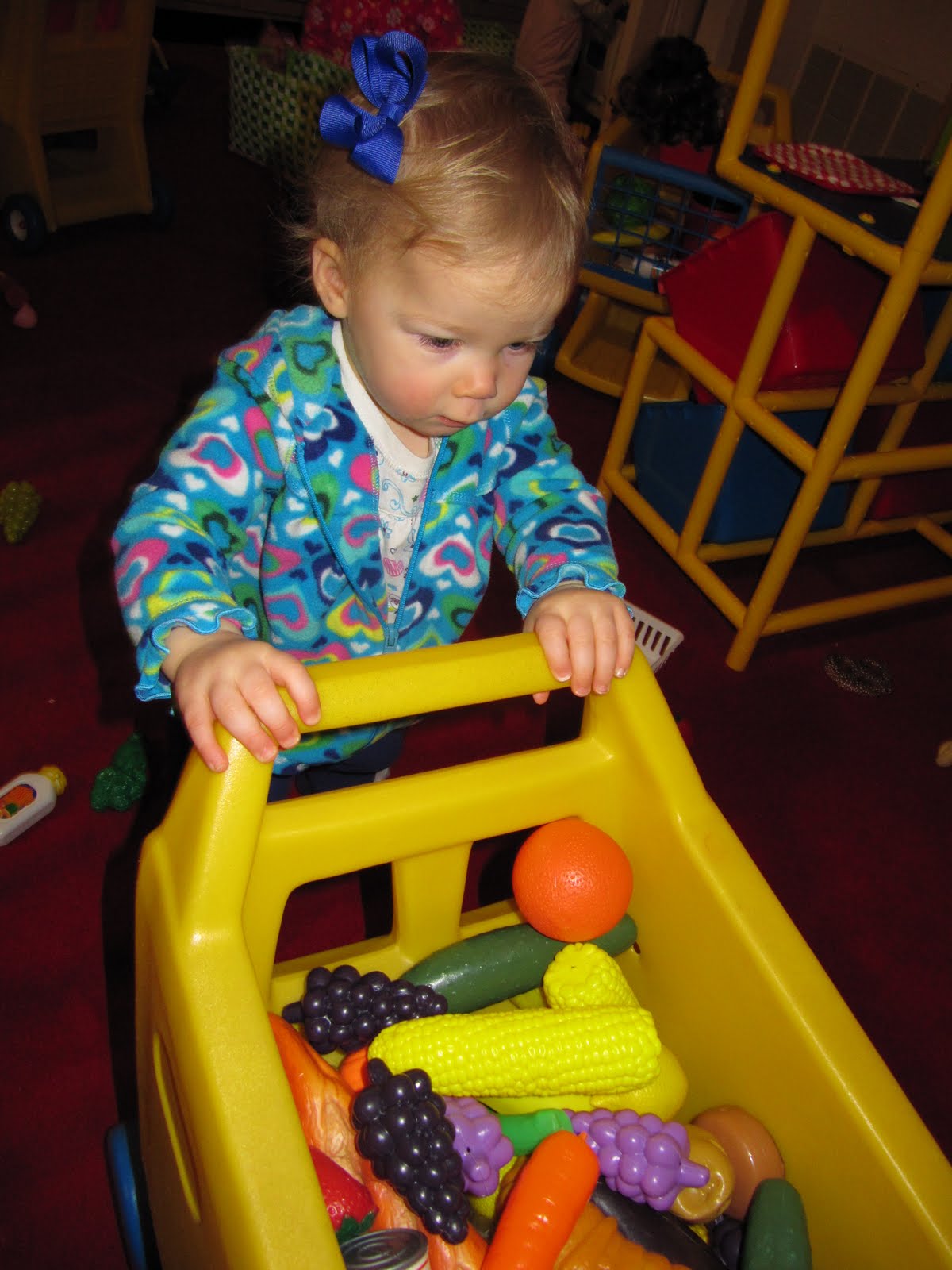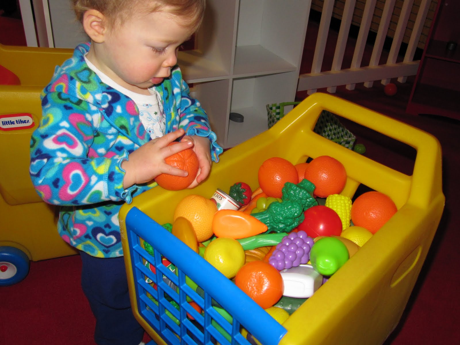 There is an area with cars, trucks, and trains. Another area has a little grocery store complete with cash register and shopping carts.