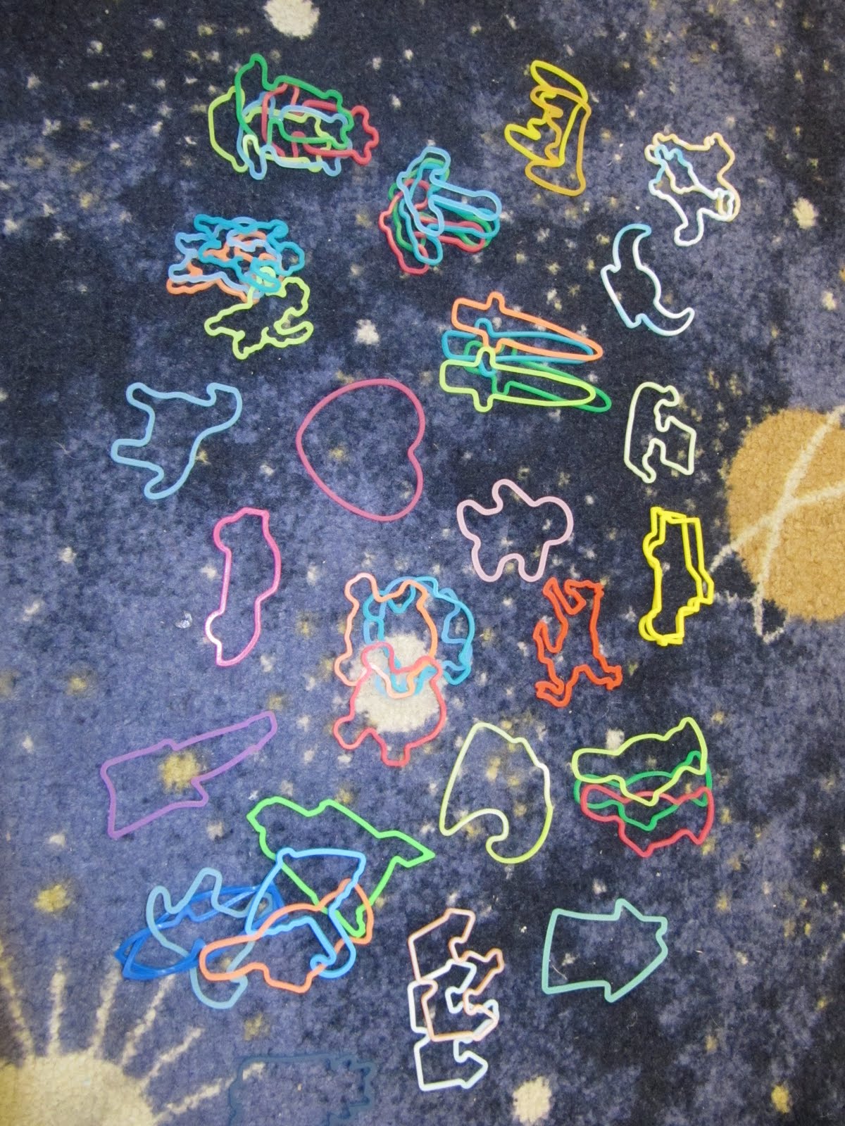 He has been given other silly bandz by friends but I’ve also bought some for him to get as rewards for doing something above and beyond. They are definitely a good motivator for my child. Who knew? Colorful shaped rubber bands?! I would have never guessed it.