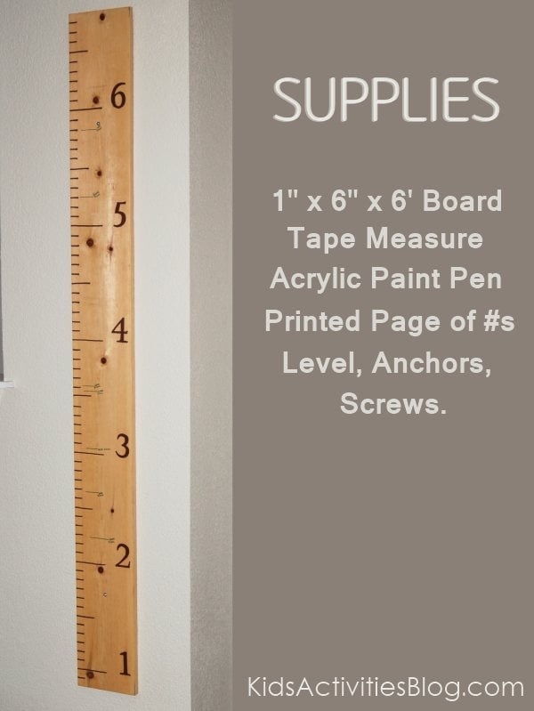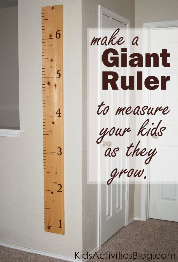 We have 8 people, 6 of whom are growing at a massive pace. I love how my in-laws have a door jam where they record all their kids and grandkids heights. They still live in the home my husband grew up in. I want to do that, have a record so my grandchildren can compare their heights to their parents when they were kids but it is unlikely that my grandchildren will visit this house, we’ll probably move half a dozen times (or not, but who knows). So I was thrilled when I discovered a full-size ruler on pinterest. It is a great idea of a way to record your child’s height and keep it irregardless of the house you are living in.
