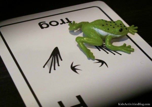 He immediately started perusing the cards and we talked about the letter sounds, the animal tracks and how they matched up. Then he grabbed the frog figurine and said, “F-F-F-R-O-G” sounding out the “F”, then he rummaged through the cards and found the “F” card representing the Frog tracks. He didn’t stop there. In fact he didn’t stop until he had matched up all 8 animals to their respective cards.