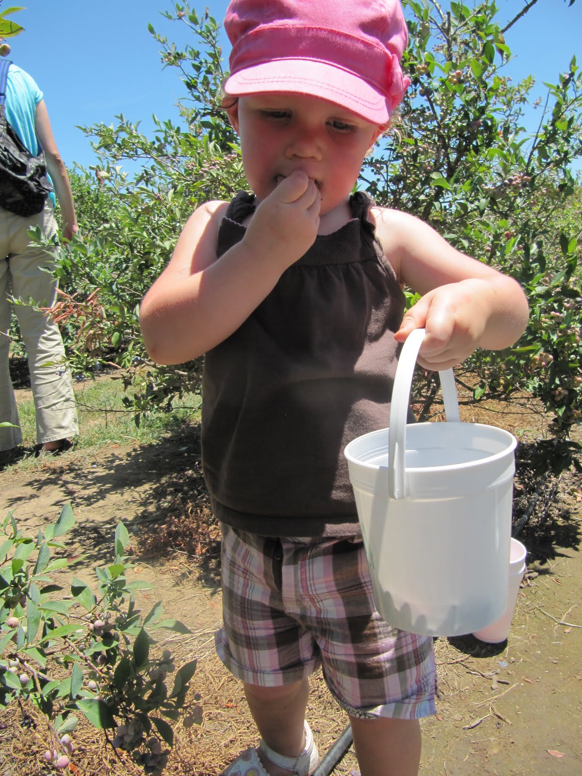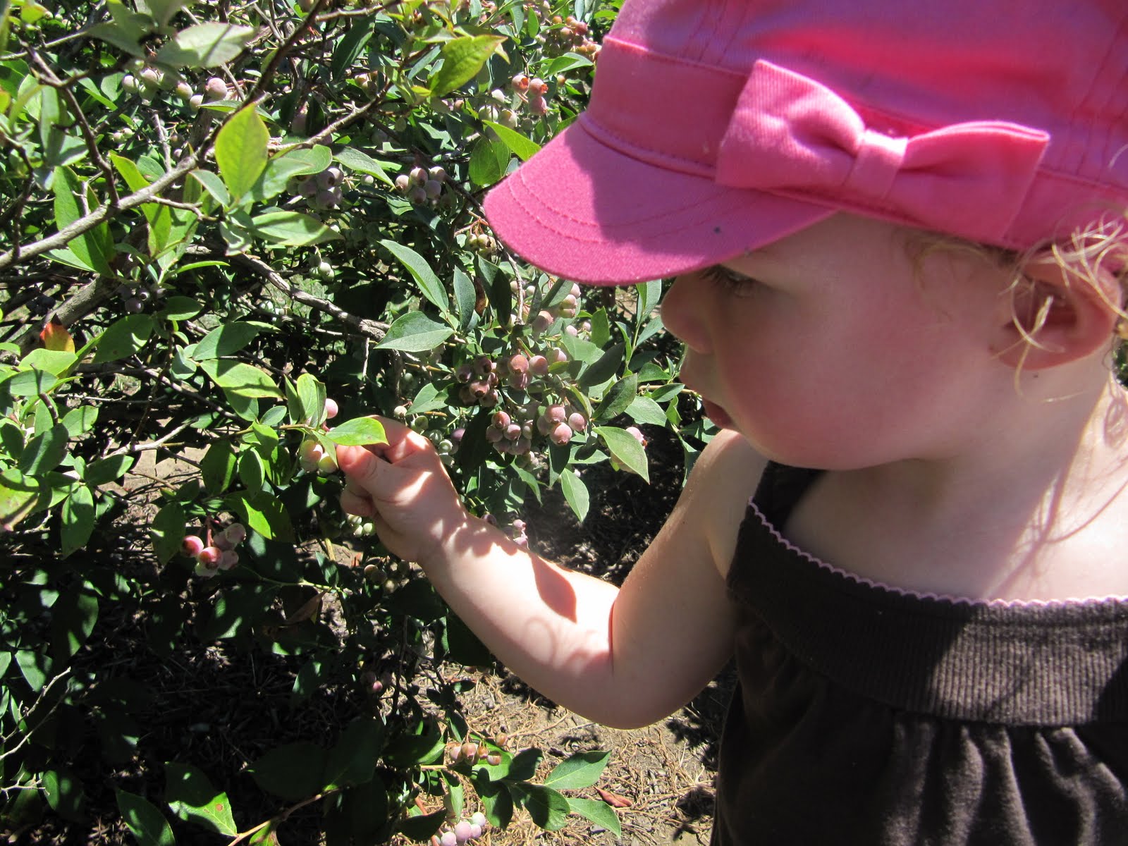 Not all of the blueberries were ripe. If they aren’t ripe they still have a pinkish color to them. But all of the bushes had big ripe berries ready for picking. At first Rachel was just picking anything and putting it in her bucket.