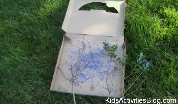A blob of blue paint on last Sunday's paper and a old pizza box were the only other things we needed to paint with branches.
