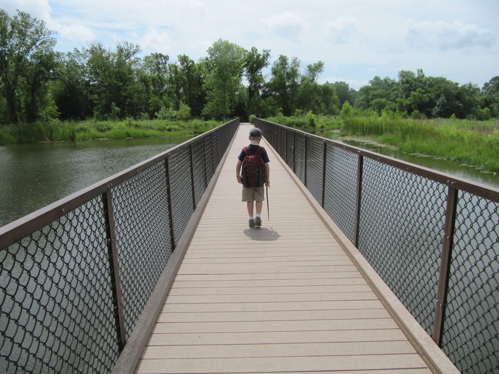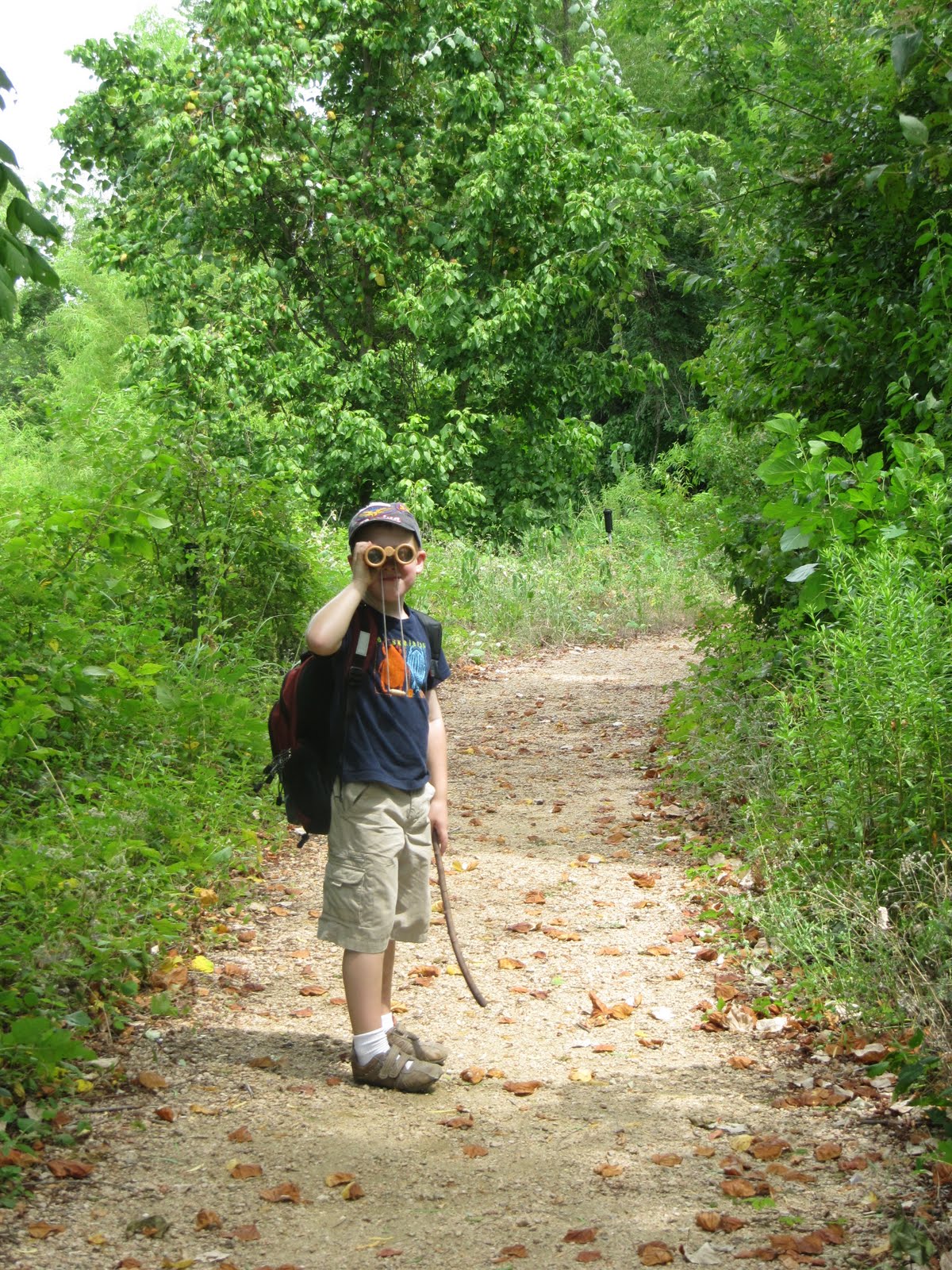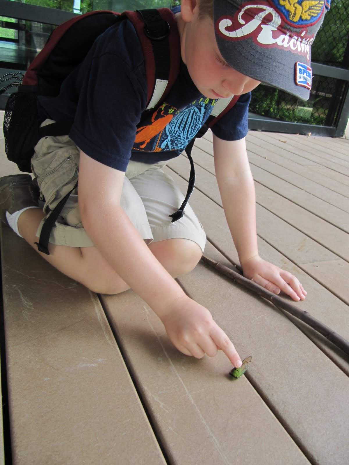 She is Dallas info: The Trinity River Audubon Center is located at 6500 South Loop 12, Dallas, TX 75217 & phone – 214-398-TRAC. Admission ranges from $3 – $6 and kids 2 and under are free. They are open Tuesday through Sunday with special hours for TRAC members. Memberships start at $60. They have a FB page here.We got to explore the Great Trinity Forest, the largest urban hardwood forest in the United States, and locate or find evidence of 5 animals and then identify one fact about each animal. We had a backpack complete with field identification guides, magnifying glasses, a compass, a pack of colored pencils, and a notepad. We were on our way! Just outside the door, Nicholas found a cicada. It was dead so he didn’t mind posing for pictures! On to the trails… Nicholas always likes to have a walking stick when we go out on trails. Boys and sticks, sticks and boys – they are truly inseparable. We saw lots of different colored dragonflies…blue, green and black.
