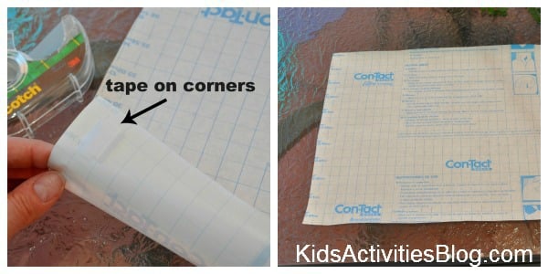 Note: Taping the Con-Tact paper to the table isn’t necessary but it made it a lot easier for my three year old to work with it because the edges didn’t roll up.