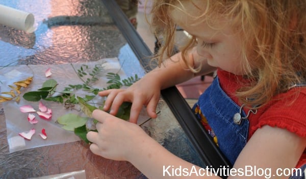 My daughter loved having the sticky side of the Con-Tact paper exposed. She quickly started placing her leaves and petals on the paper.