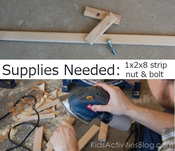 Cut the strips into 1-2 feet lengths (depending on how long your kids want them – longer is more unstable and harder to maneuver in battles). Cut another two 4-5 inch segments per sword. After you sand all the wood to remove splinters, drill a hole the width of your bolt through the three boards, one sword and two handle segments. Add a bead of glue where the handle meets the sword and thread the bolt through the hole, adding the nut to the end. If you want to have fewer bruised knuckles (but a greater risk of splintering the sword during battle) you can counter sink the bolt and nut so they are flush with the sword.