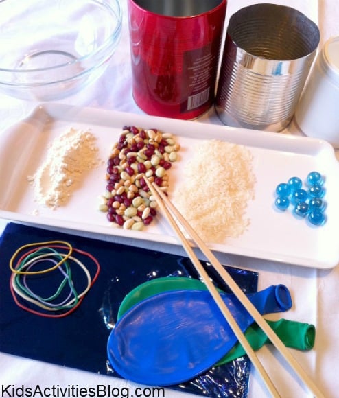 - Various materials to bounce on the drums (we used rice, flour, dried beans and marbles)