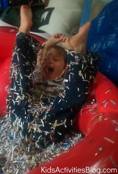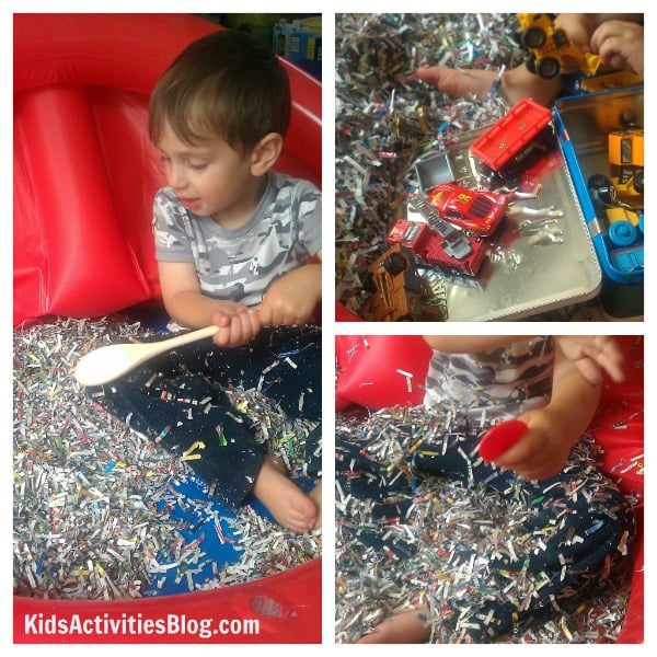 This turned out to be one of my son's favorite sensory bins to date ¦ and to think, it was all done without much preparation! If you don't have access to the contents of a shredder, perhaps using the Crinkle Cut Paper Shreds that are used when packing presents and are sold at a craft or gift store would suffice.