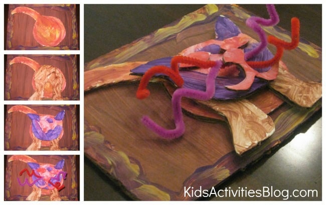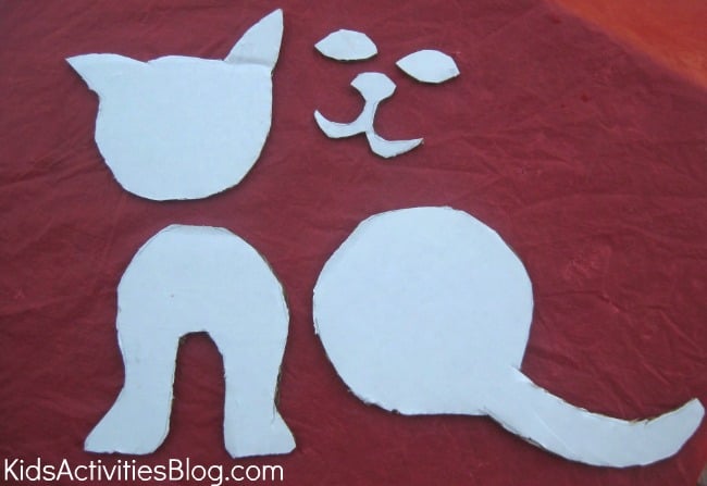 Once the paint dried, we looked back at the original sketch and arranged the pieces of our cat in the correct order: background, then back with tail, then legs, then head, then eyes. We carefully used our hot glue gun and assembled the pieces together. We then found our pipe cleaners and created curly whiskers, attached them to the nose, glued that onto the face, and voila! A 3D cat!
