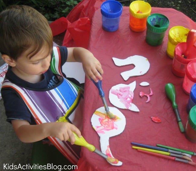 When we returned home, we took our paints off of my son's easel and brought them outside. My son painted each of the individual pieces and we set them out to dry.
