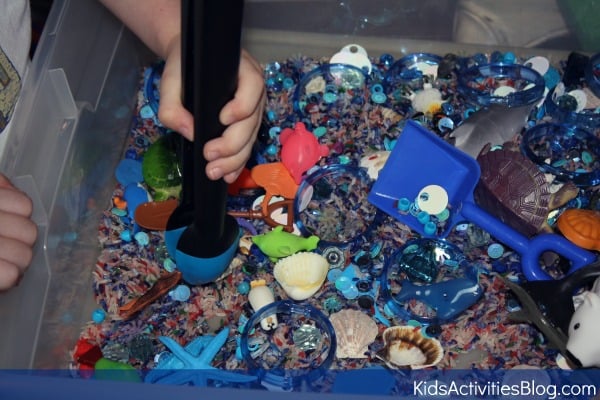 ocean sensory bin focused on the underwater world. ย We use a plastic under the bed storage bin for our indoor sensory tub. ย That way, I can actually put a lid on it and ย slide it under the bed until next time. ย I already had the colored rice to use as the main component in the bin. ย It was a mix of all the dyed rice we โขd used in previous bins. ย I opted not to re-dye because I thought it added a nice contrast and didn’t quite have the time.