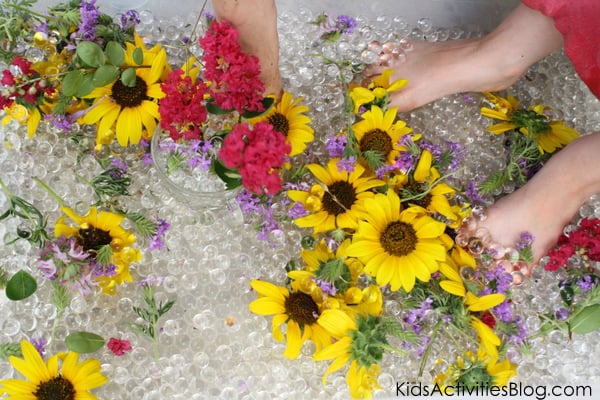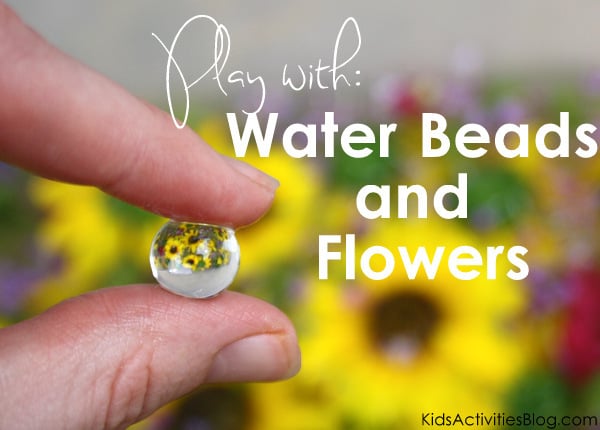 I feel like I have come full circle with this activity. Water beads were originally manufactured for florists to be used with flowers. Since then though, parents have been putting them to all kinds of creative uses. ย Water beads can be lots of fun on light tables, with shaving cream, and in science experiments, to name just a few examples. ย We decided to go back to basics the other day though and to have fun with water beads and flowers in a sensory tub.