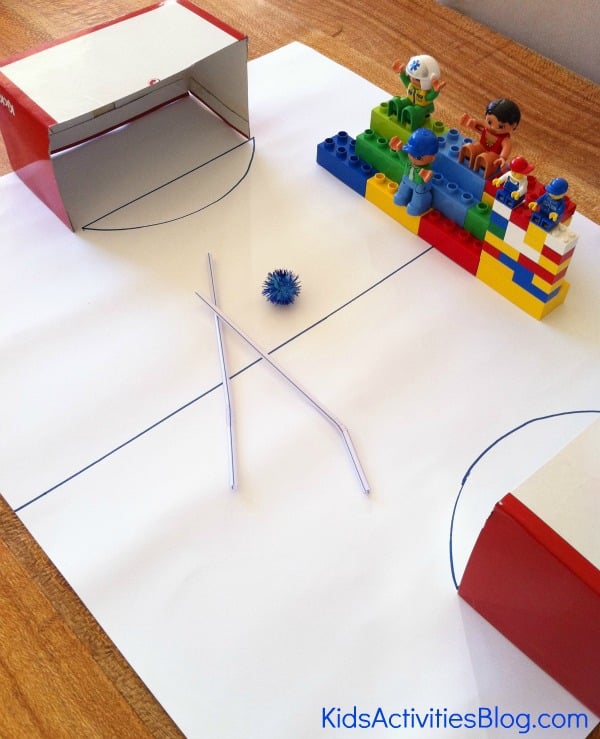 - Place a pom pom (your soccer ball!) in the center of the field.