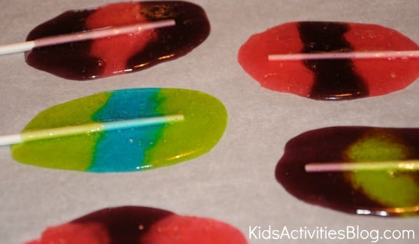- Place one end of a lollipop stick in each melted candy and roll the stick to cover all sides.