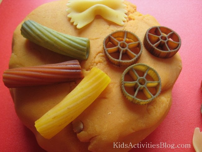 This game needs an interesting mix of pasta shapes, so see what you can find. We included cartwheels, tubes and bow ties.