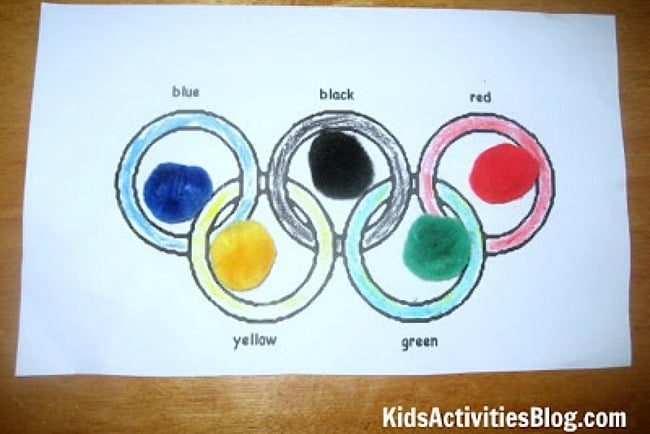 You will need a bag of multi-colored pom poms, a container to hold the pom poms before they are transferred to the rings, a copy of the Olympic rings with the rings colored in, and a fun way to transfer the pom poms.