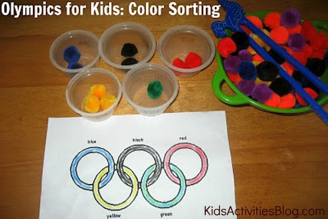 - Your child can then use chopsticks, tweezers, tongs, or spoons to put the correct colored pom pom on a colored Olympic ring.