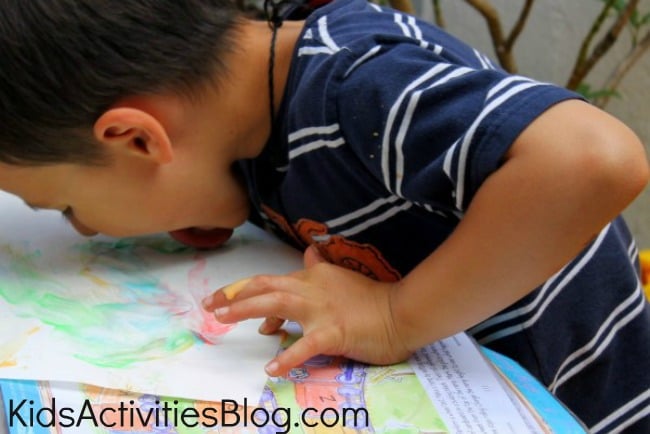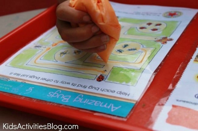 Now find some of your child’s fun worksheets and laminate them. We used clear contact paper but you could also just stick the worksheet in a large baggie. Have your child complete the worksheet with their fun edible ink instead of regular dry erase markers.