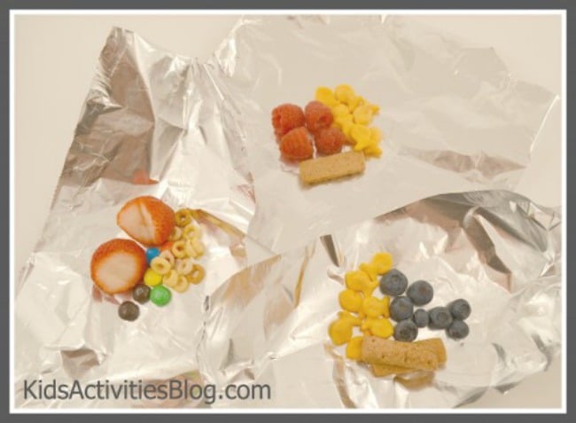 2. Place small finger food snacks in the center of each piece of foil.