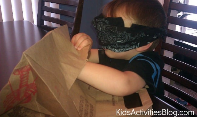 Since it only took a few minutes to get through the four bags, we decided to play it again ¦ this time blindfolded so there was no peeking! My son occupied himself for a few minutes while I reset the discovery bags. As the T-rex bag was ripped a little too much when the dinosaur was extracted, we only used three this time. Into the bags went a banana, a fork, and a lollipop, and on went the blindfold (he did it himself).