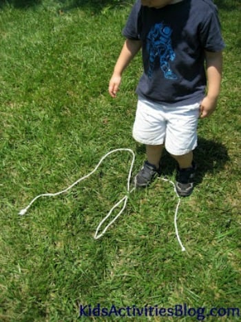 After forming the letter, what would be more fun the slipping along the rope with a sideways walk or balancing on it while stepping forwards. Actually having your child help you set out the rope and having them decide how to move from the top to the bottom, bottom to the top, left to the right or right to left would be fun. My son decided to slide sideways as he moved around the letters every time. Why? He reasoned he could see where he was going that way. No matter how your child decides to move around the shape I bet they will have fun ย with rope letters.
