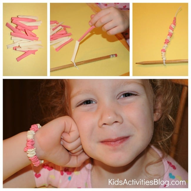 Thread the balloons on the elastic. I temporarily tied one end of the elastic to a pencil just to keep the balloons from sliding off the other end during threading. Kids will love threading their own bracelets.