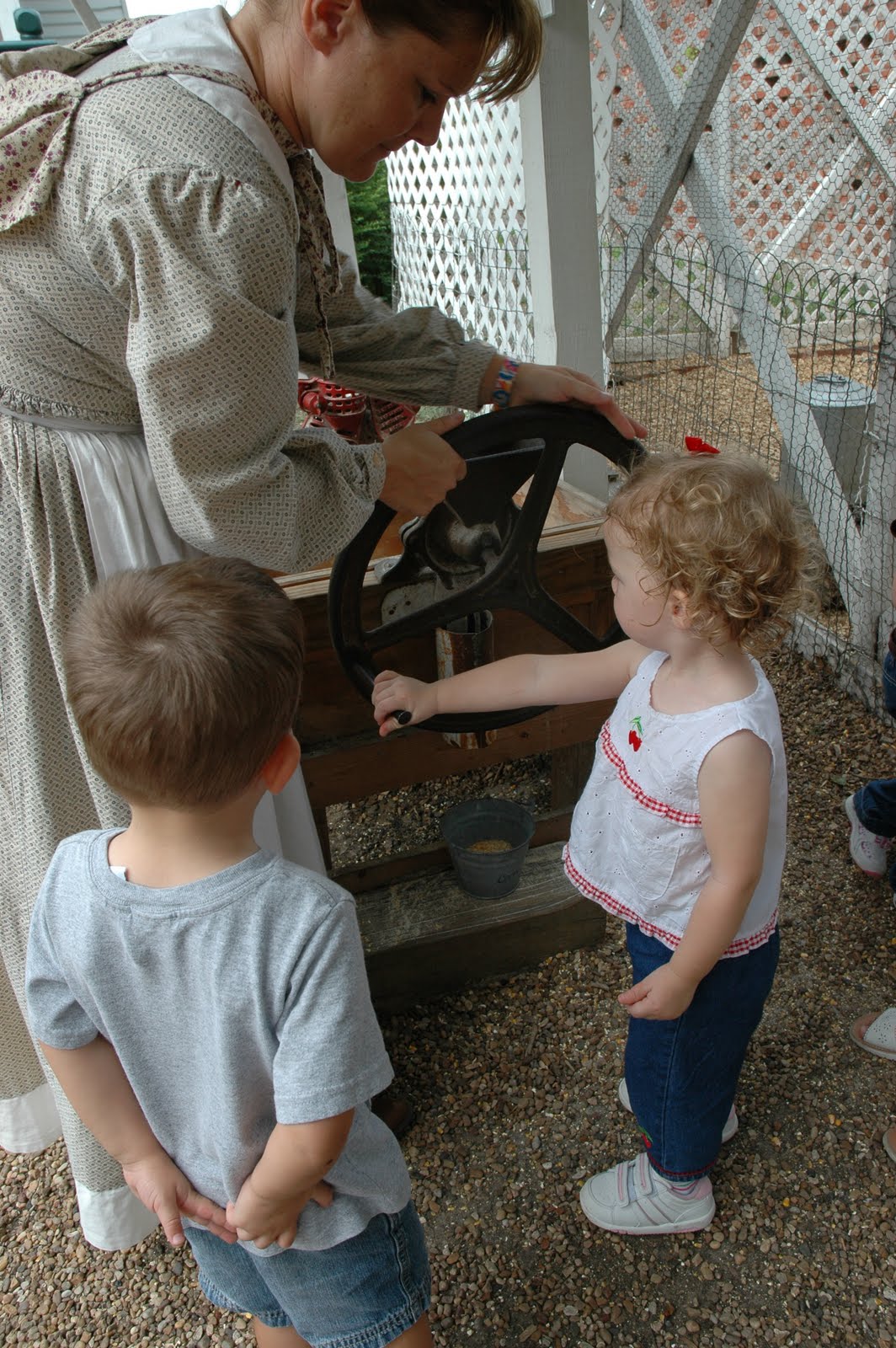 The staff at Heritage Farmstead are so great with little kids. ย They encourage hands-on activities but they quietly help the kids out when needed. ย Rachel was so proud that she used the corn mill “all by herself” and she never noticed Ms. Victoria standing there “helping” the handle turn.