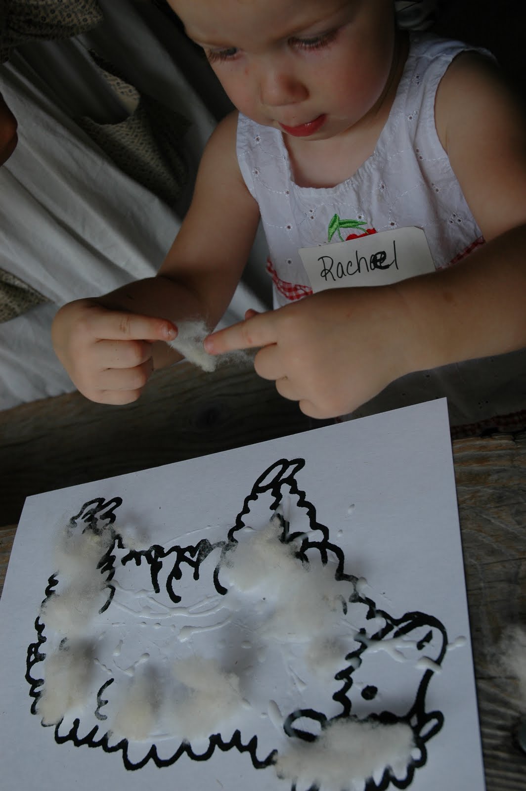 Next the children were given some real sheep wool. ย Rachel pulled off little pieces of wool and placed them on her sheep.